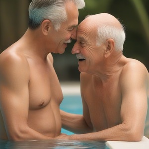 Kom even passen, ik hielp hem uit z’n broek… mmmm en trok z’n zwembroek over z’n oude benen, ga eens staan, en trok hem over z’n oude lekkere kont.