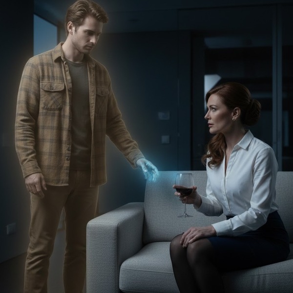 De kamer leek te kantelen. Het strakke appartement, de designbank, de glazen wijn — alles loste op in een waas van mist. Evelyn voelde haar voeten de grond verliezen, alsof ze werd opgetild door een kracht die niet fysiek was, maar onverbiddelijk.