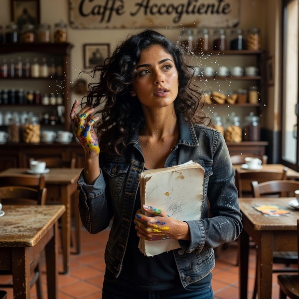 Toen ze binnenkwam, Giulia, leek de regen even te pauzeren. Ze schudde haar donkere krullen uit, waterdruppels parelend op haar olijfkleurige huid, en haar lach klonk als een melodie toen ze haar jas uitschudde. Ze was jonger dan ik, misschien achtentwintig, met een schetsboek onder haar arm en verfspatten op haar vingers. Haar ogen, diepbruin en vol leven, vonden de mijne terwijl ze een tafel zocht. Ik glimlachte onwillekeurig, een hitte die opsteeg in mijn borst, als een vonk in de vochtige lucht. Ze aarzelde, wees naar de stoel tegenover me en vroeg in gebroken Engels: “Is this seat taken? The rain, it chases everyone inside.”