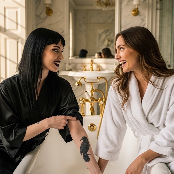Omdat die bubbels nogal lawaai maken zet ik het systeem uit, me niet realiserend dat nu het water tot rust komt mijn zus volledig zicht heeft op mijn blote lijf, dat er inmiddels wel heel anders uitziet dan het hare. Ze valt helemaal stil en pas als ze van de schrik van al die tattoos en ringetjes zo her en der is bekomen komt ze naar me toe om te huggen. Als ze dan ook nog dat ‘F.U.C.K’ op mijn vingers ziet staan vraagt ze: ‘Jesus Loo, ben je niet een beetje aan het overdrijven?’ Op de een of andere manier ben ik net zo verlegen met deze situatie als Gee en voel de neiging m’n hand te verstoppen en m’n lijf te bedekken. Ik ben hier langzaam naartoe gegroeid en vind dit op dat ‘F.U.C.K’ na wel normaal eigenlijk, maar voor haar moet dit wel heel vervreemdend zijn. We hebben immers bijna identieke lichamen, of beter gezegd, dat hadden we…
