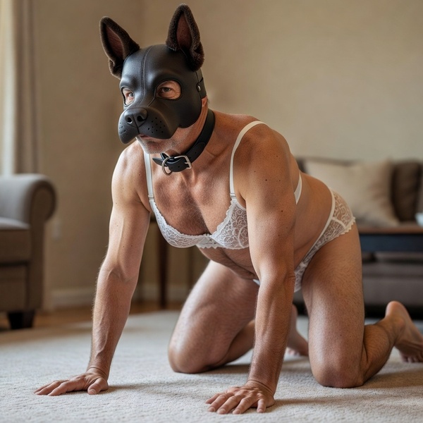 Evelien ging voor mij zitten, zo, dan zullen we eens beginnen. Om jou de juiste training te geven ben jij vanaf nu mijn teefje, ze nam een handspiegel en hield die voor mijn gezicht. Ik zag inderdaad dat ik een masker ophad met een snuit als van een hond. Ook twee oren bovenop het maskertje als de gespitste oren van een hond. Ik vond het wel een beetje raar, maar tegelijk ook spannend, nou ja, eigenlijk ontzettend geil.