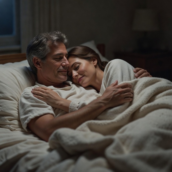 Bij Fred en Sarah gebeurde iets gelijkaardigs. Hier werd Fred eerst wakker en hij voelde Sarah die tegen hem aan gekrold lag, met in één hand zijn piemel, die half hard was, vasthouden. Zelf had hij een arm onder haar lichaam door, geschoven en de hand van die arm lag op haar kontje. Hij had die hand zelfs iets doorgeschoven in zijn slaap en die lag, langs achter, tussen haar billen, tegen haar kutje. Fred besloot niet te bewegen en te genieten van het moment. Zeker meer dan een half uur later, werd Sarah ook wakker en Fred deed alsof hij sliep, toen Sarah vaststelde, in welke houding ze beiden tegen mekaar lagen. Sarah liet haar hand gewoon liggen. Fred deed dat ook. Na een kwartiertje deed Fred alsof hij pas dan wakker werd en Sarah trok haar hand schielijk terug. Fred deed dat maar ook. Hij rekte zich uit en zei : “ik heb zalig geslapen, Sarah”. “Bedankt daarvoor” en hij gaf Sarah een kus op het voorhoofd. “Ik ook” fluisterde Sarah.
