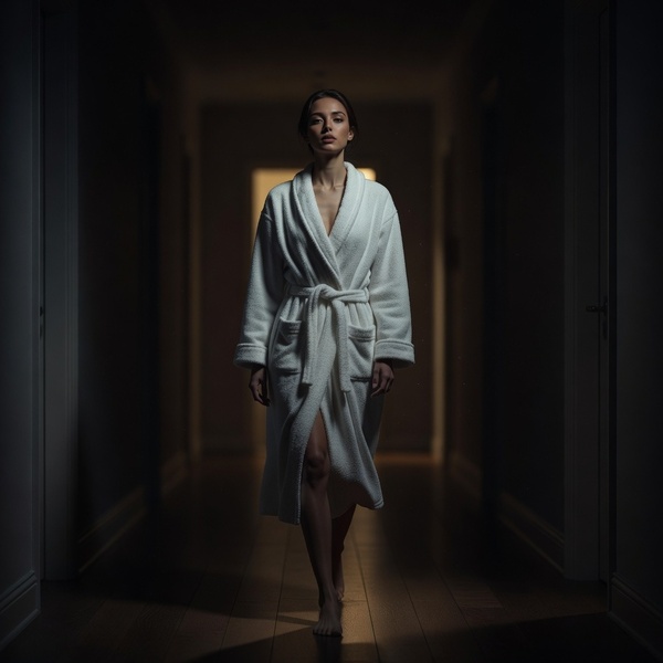 Ik liep langzaam, op blote voeten. Geen handdoek dit keer. Alleen mijn badjas. Niets eronder. Naakt verlangen.