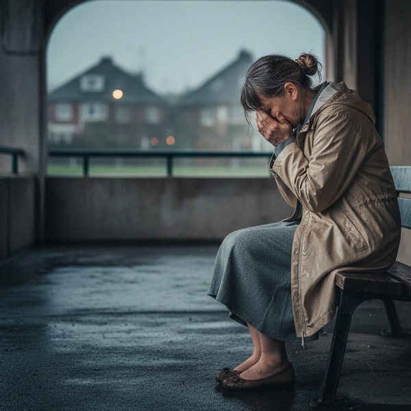Haar haar was in een praktische knot gebonden, grijs doorspekt met dof bruin, en ze droeg een vormeloze regenjas over een eenvoudige grijze jurk die tot over haar knieën reikte. Haar schoenen waren plat en versleten, het soort dat je draagt voor comfort, niet voor stijl. Haar gezicht was verborgen in haar handen, tranen vermengden zich met regendruppels op haar wangen. Ze zag eruit als een typische huisvrouw uit de suburbs, iemand die je voorbij zou lopen zonder een tweede blik. Iets in mij, misschien medelijden of een vlaag van eenzaamheid, dreef me naar haar toe.