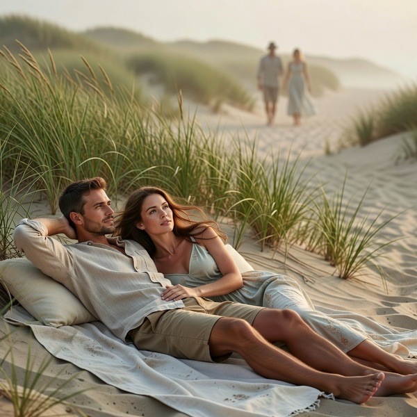 Mijn man trok me snel overeind, we renden over het strand. Hij greep onze spullen. We doken samen in het helmgras, bedekt, verborgen. Onze harten sloegen luid. We lagen op onze buik, adem inhouden. Blote lijven in het zand.