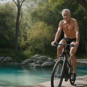 Na een km of 15 bedacht ik me dat een frisse duik in het meer wel lekker zou zijn en dat ik me daarna wel zou droog lopen. Dus schoenen, sokken en shirt uit en met m’n tight als zwembroek het water in. Na een paar baantjes getrokken te hebben weer terug naar de kant. Daar stond een man in z’n scootmobiel. Ik schatte hem een jaar of 70 misschien 75. Zo lekker aan het het sporten riep hij me toe. Duidelijk zin in een praatje. Terwijl ik het water uit kwam stelde hij zich voor als Jaap. Hij vertelde dat hij vroeger ook veel gesport had maar dat zijn lijf niet meer meer werkte. Ik merkte op dat hij er nog goed uit zag en vroeg hoe oud hij was. 78 ! Zo dat had ik u echt niet gegeven meneer.