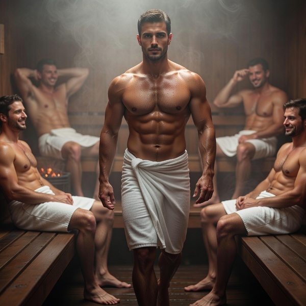 Als ik me uitkleed in de kleedkamer merk ik dat ik eigenlijk best moe ben en nog niet echt in de stemming voor seks. Laat ik dus eerst maar naar de sauna gaan om te ontspannen. Net als de vorige keer word ik van top tot teen bekeken wanneer ik de sauna binnenstap, maar ik negeer de blikken. Ik ga languit liggen, sluit mijn ogen en laat de warmte zijn werk doen. Langzaam zakt de spanning uit mijn lijf en kom ik tot rust. Na een kwartiertje stap ik eruit, neem een lekkere koude douche en loop daarna richting de lounge voor een drankje.