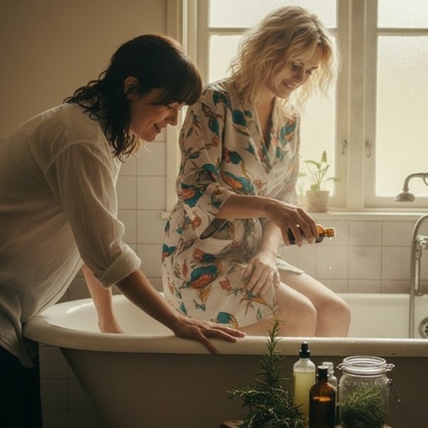 Sanne draaide behendig aan de kranen terwijl Lotte zich over de badolie ontfermde. De geur van rozemarijn en dennen vulde de ruimte, kruidig en prikkelend. Zonder veel omhaal stapten ze het hete water in. Het bad was krap, een noodgedwongen intimiteit die ze allebei zochten. Sanne ging zitten en trok Lotte naar achteren, zodat Lotte met haar rug tegen Sanne’s borst en buik aan leunde, veilig omsloten door Sanne’s benen.