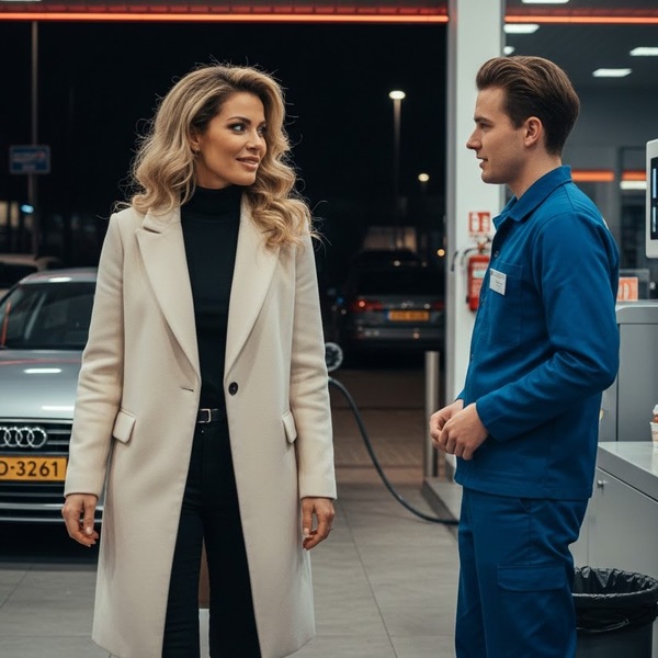 Als ik deze avond de zoveelste klant heb afgerekend na het tanken ben ik blij dat mijn dienst bij de benzinepomp er bijna opzit. Het is redelijk druk geweest deze dienst en ben er met gemak wel klaar mee. Om 23.00 uur gaat de pomp sluiten en het is nu half 22.30 uur, en ik begin alvast met opruimen en prullenbakken leeg te halen zowel binnen als buiten. Tegen de tijd dat ik hiermee klaar ben is er weer een kwartier verstreken en er komt nog een mooi zilver grijze Audi A3 het terrein oprijden en de dame die uitstapt begint met tanken. Als ze klaar is hangt ze de slang terug en komt sierlijk naar binnen lopen, en ze besteld nog een pakje sigaretten en ik noem het bedrag wat ze moet afrekenen. Ze houd haar pasje boven het apparaat en de betaling word goed gekeurd. Ze kijkt me lachend aan en ik zie dat ze mooie diepe bruine ogen en dik blond haar.
