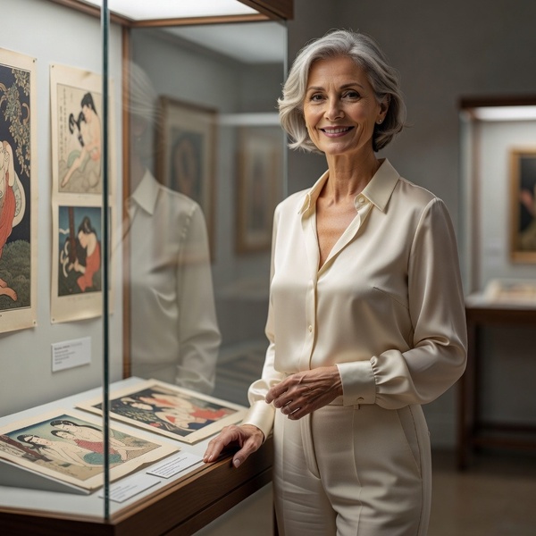 Het was een rustige donderdagmiddag in een kleine, exclusieve kunstgalerie in het centrum van de stad. De galerie specialiseerde zich in moderne en klassieke grafiek, met een aparte sectie voor erotische prenten uit de 18e en 19e eeuw. Elena, een 66-jarige dame stond al een tijdje bij een vitrine met Japanse shunga-prenten en Franse gravures van Courbet en Balthus. Ze droeg een elegante, crèmekleurige blouse met een diepe V-hals die haar nog steeds volle, zachte borsten subtiel accentueerde, gecombineerd met een lichte pantalon. Haar zilvergrijze, korte haar viel losjes om haar gezicht, en haar glimlach was warm en zelfverzekerd.