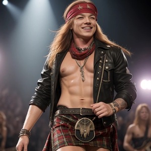 Vanavond heb ik weer eens m’n rooie kilt aan gedaan, zo’n schotse rok die tot op mijn knieën hangt, met aan de riem zo’n tasje met een flos dat voor mijn kruis bungelt. Altijd is het weer spannend of ik er iets onder draag, voor iedereen is dat duidelijk een vraag, een kwestie die ik op het podium goed uitbuit. Eronder draag ik m’n kistjes en verder heb ik een zwarte bloes aan die ik met een paar knoopjes heb dicht gedaan. Een rode bandana is de finishing touch en als we opkomen voel ik meteen de opwinding bij al die chickys, het smoezen over mijn wel of niet aanwezige underwear komt in no time op gang.