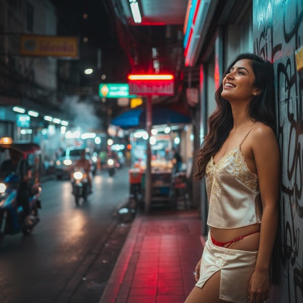 “We kunnen vanavond eens gaan kijken. We vinden wel iets,” zei Jens. Ik vond het geweldig dat hij zo meeging in mijn fantasie, ook al was het voor hem niet zo evident. Maar hij wist dat ik zo was en onmogelijk kon veranderen. Hij wist ook dat ik van hem, en hem alleen, enorm veel hield. Ik kuste hem. We deden niet zo heel veel tijdens de dag. Gewoon wat rondwandelen, allerlei bezienswaardigheden bezoeken, uit eten gaan. De hele dag liep ik rond met een kletsnatte kut. Ik had er echt wel zin in. Als het eenmaal avond werd, werd het eveneens heel wat drukker op straat. De verschillende hoerenbuurten openden hun deuren. Rode lichten, schaarsgeklede dames. Niet enkel Thai maar ook andere nationaliteiten waren te vinden. Jens werd meerdere malen aangesproken met de vraag of hij zin had in een blowjob. Net zoals hij mij niets in de weg legde, liet ik hem ook vrij om te genieten. We besloten echter om wat verder te gaan en de drukke buurten achter te laten.