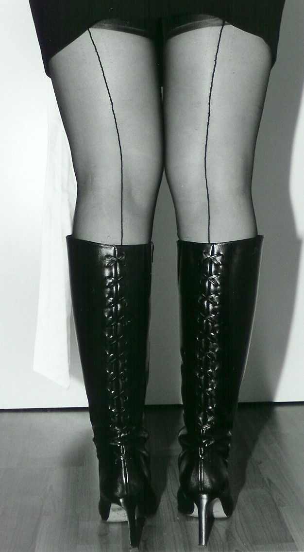 Gelukkig daar ben je, zegt ze ondeugend, haar verschijning straalt zelfvertrouwen en verfijning uit. Ze draait zich om en loopt voor je uit door de gang. Ze draagt een strakke, hoog getailleerde kokerrok van glanzend zwart leer die als een tweede huid om haar heupen en billen spant en haar slanke figuur accentueert zonder te veel prijs te geven. Hij zit zo nauw dat elke beweging de contouren van haar lichaam perfect volgt. De rok eindigt precies op de knie, maar door een verborgen split achter loopt de naad van haar nylon kousen ononderbroken door. De naad trekt je aandacht en leidt je ogen als vanzelf naar beneden.